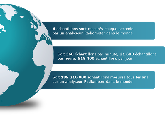 En effet, 5 échantillons sont prélevés chaque seconde par un dispositif d'analyse de Radiometer quelque part dans le monde. Cela représente 300 échantillons par minute, 18 000 échantillons par heure, 432 000 échantillons par jour. Cela représente 157 680 000 échantillons par an, prélevés par un dispositif d'analyse de Radiometer quelque part dans le monde.