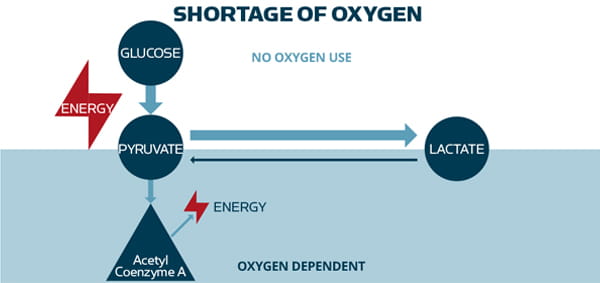 De lichaamscellen produceren energie door glucose om te zetten in pyruvaat, dat vervolgens wordt omgezet in Acetyl Coenzym A – de belangrijkste energiebron van het lichaam [5]. Het laatste deel van het proces is afhankelijk van zuurstof. Wanneer het zuurstofniveau onvoldoende is, wordt het pyruvaat gemetaboliseerd tot lactaat [5].