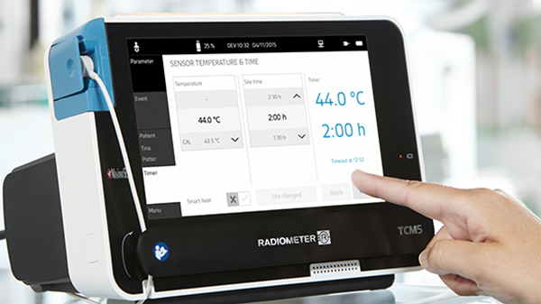 De Radiometer TCM5 FLEX transcutane monitor helpt de ongemakken voor de patiënt te beperken met door het systeem vastgestelde tijdslimieten van de meetplek ten opzichte van de temperatuur om het risico van schade door de verwarmde sensor te verminderen via vooraf ingestelde combinatie van tijd en temperatuur.